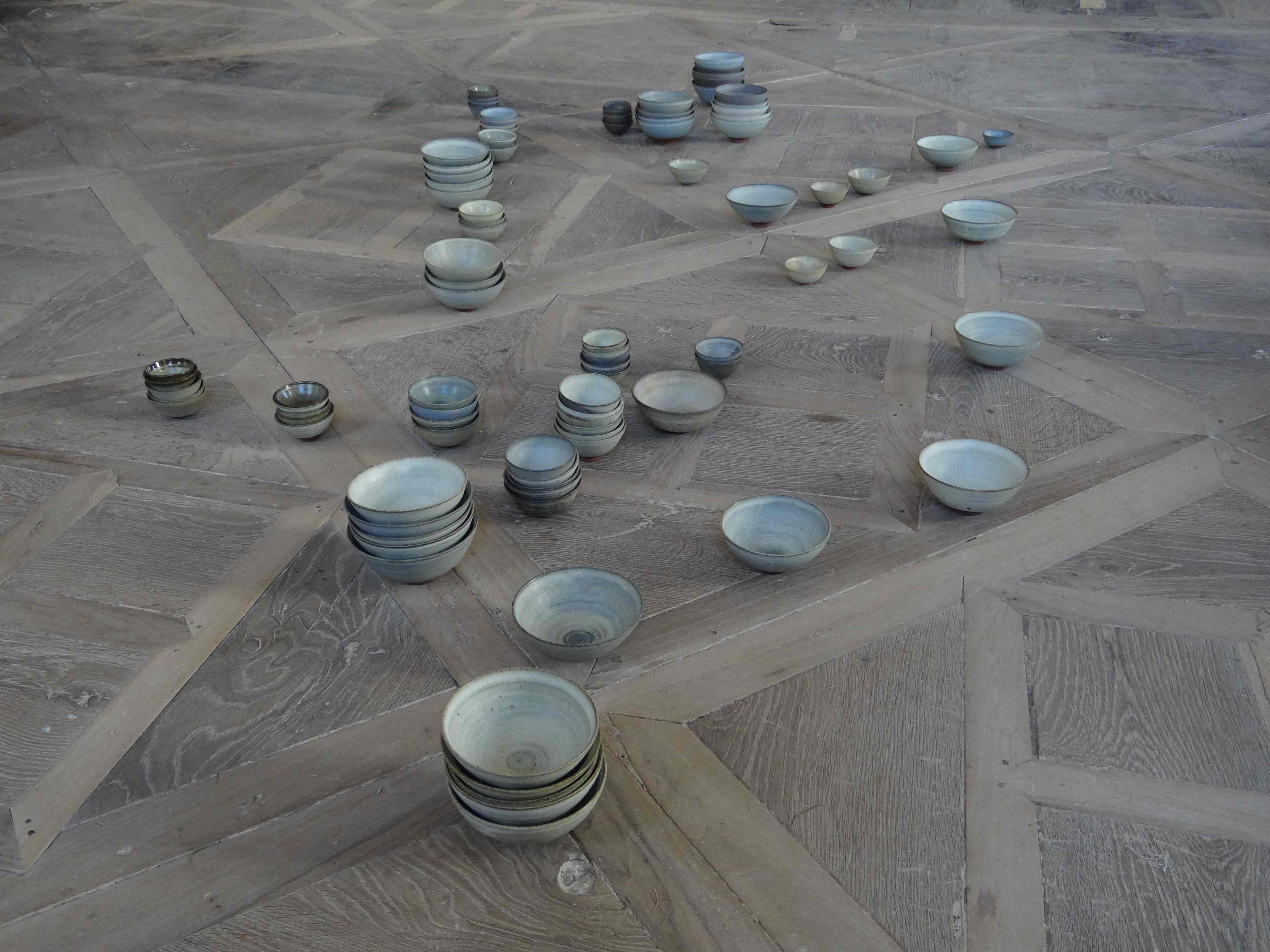 Les bols exposés sont solides, bruts et poreux, juste biscuités. J’ai déposé chaque bol sur le sable pour créer un ensemble, une harmonie, un paysage. Je suis allée à la source au sein de cette église pour y puiser l’eau qui remplit les bols.