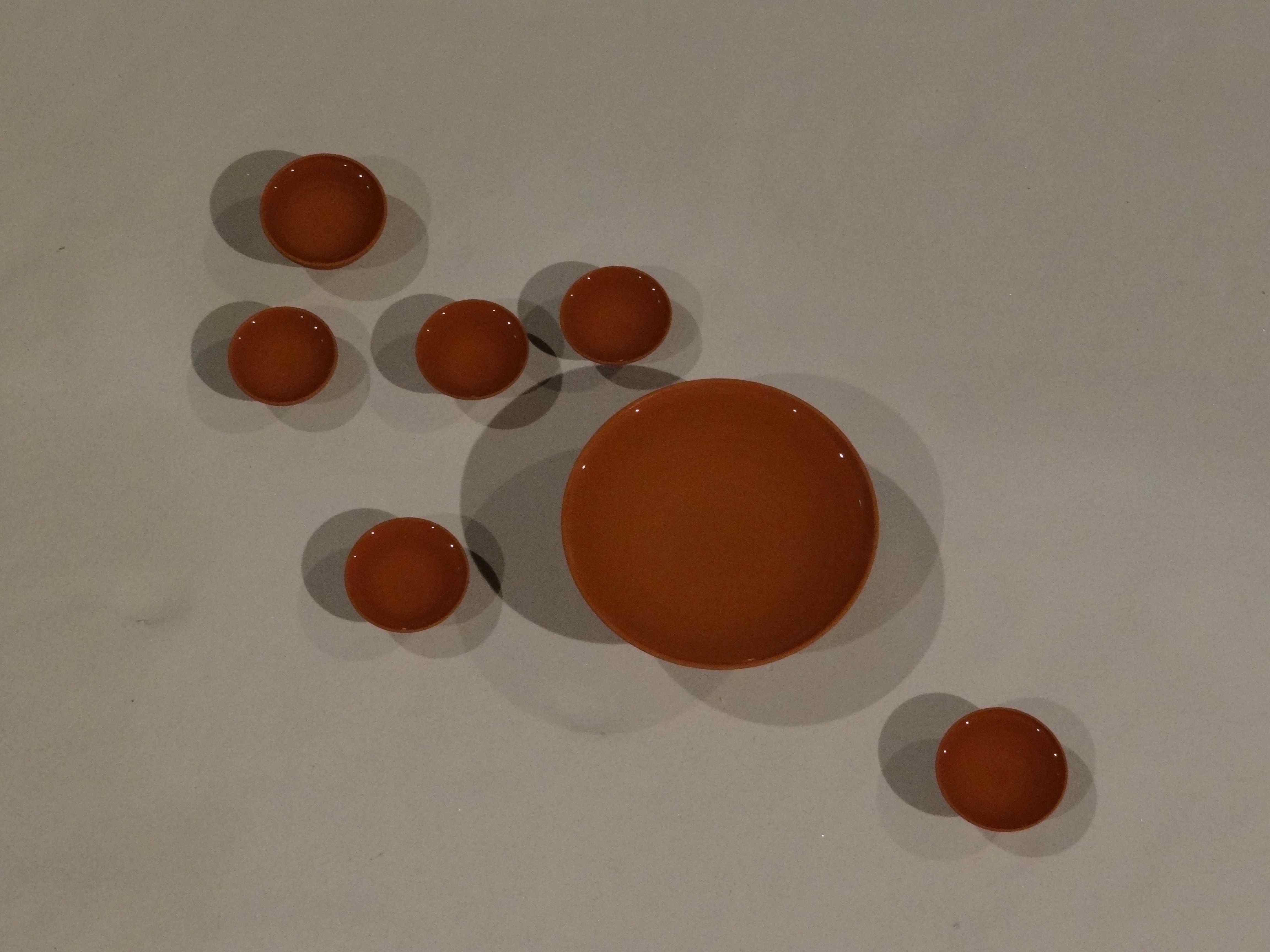 Avec mes mains, un tour de potier et mon savoir-faire je façonne la terre en bols. Ces bols sèchent au coin d’une étagère, l’eau s’échappe. Puis le temps du feu arrive. Une première cuisson à 980°C nommée biscuit permet de solidifier la forme façonnée. A cette température l’argile devient solide mais n’est pas cuite en son cœur, elle est encore poreuse. Cette porosité est précieuse, elle permet à l’argile de recevoir l’émail qui donne la couleur et la texture à l’objet. Un émail est un mélange savant de cendres de végétaux et de minéraux. Après l’application de l’émail il faut à nouveau attendre que l’eau s‘évapore. Puis le temps du feu revient. Une deuxième cuisson à 1250°C est nécessaire. Durant cette cuisson l’argile et l’émail se transforment en pierre, ces deux éléments se lient l’un à l’autre intimement.